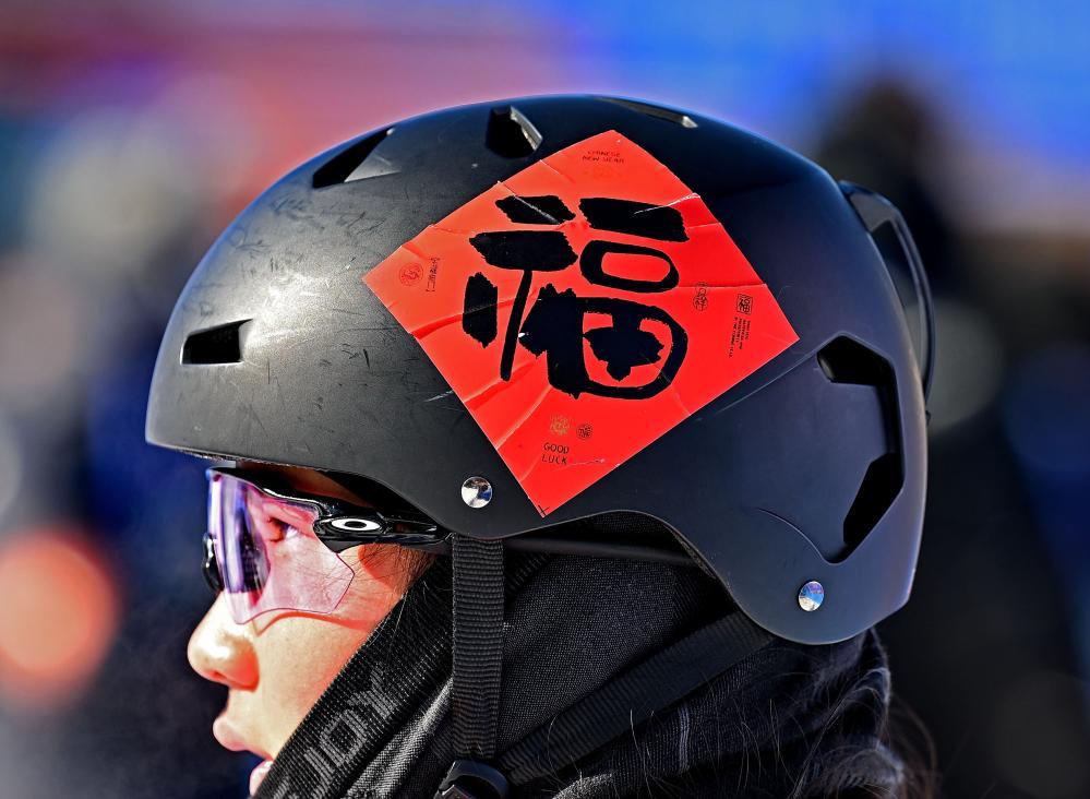 2月22日,河北队选手陈雪铮的头盔上贴着“福”字。新华社记者 牟宇 摄
