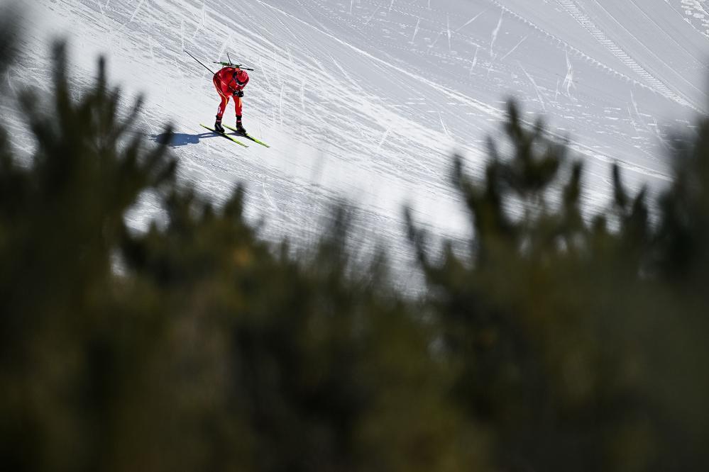 2月22日,辽宁队选手李学志在冬季两项公开组男子4X7.5公里接力比赛中。新华社记者 伍志尊 摄