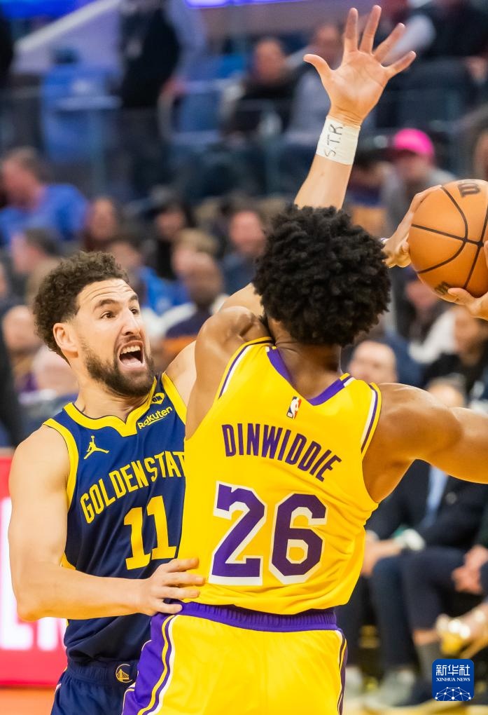 2月22日,勇士队球员克莱·汤普森(左)在比赛中防守湖人队球员丁威迪。新华社发(董旭东摄)