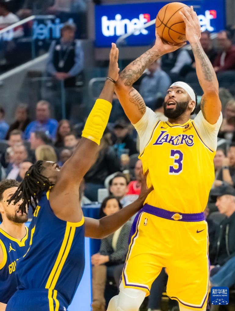 2月22日,湖人队球员安东尼·戴维斯(右)在比赛中投篮。新华社发(董旭东摄)