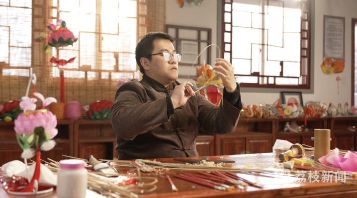 上大学后,顾传敬开始正式接触花灯制作,一边跟着厂里的老师傅学习如何系统制作花灯,一边随父亲走进大学校园,担任同声传译,向高校留学生们展现灯彩的非遗魅力,前期准备英文展示课件时,顾传敬第一次完整了解了秦淮灯彩几经兴衰、千年不辍的发展历史,更加深了他对花灯制作的兴趣。