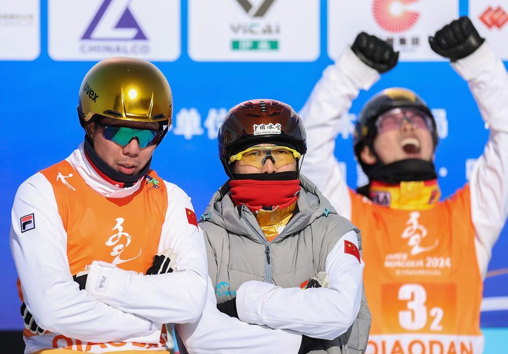 最后一跳,王心迪着陆时背部率先着地,在回到等候评分区域的第一时间,他懊恼地用双手猛击了一下自己的头盔,贾宗洋上前拍了拍他。最终,辽宁队以13.44分的差距不敌内蒙古队,屈居亚军。