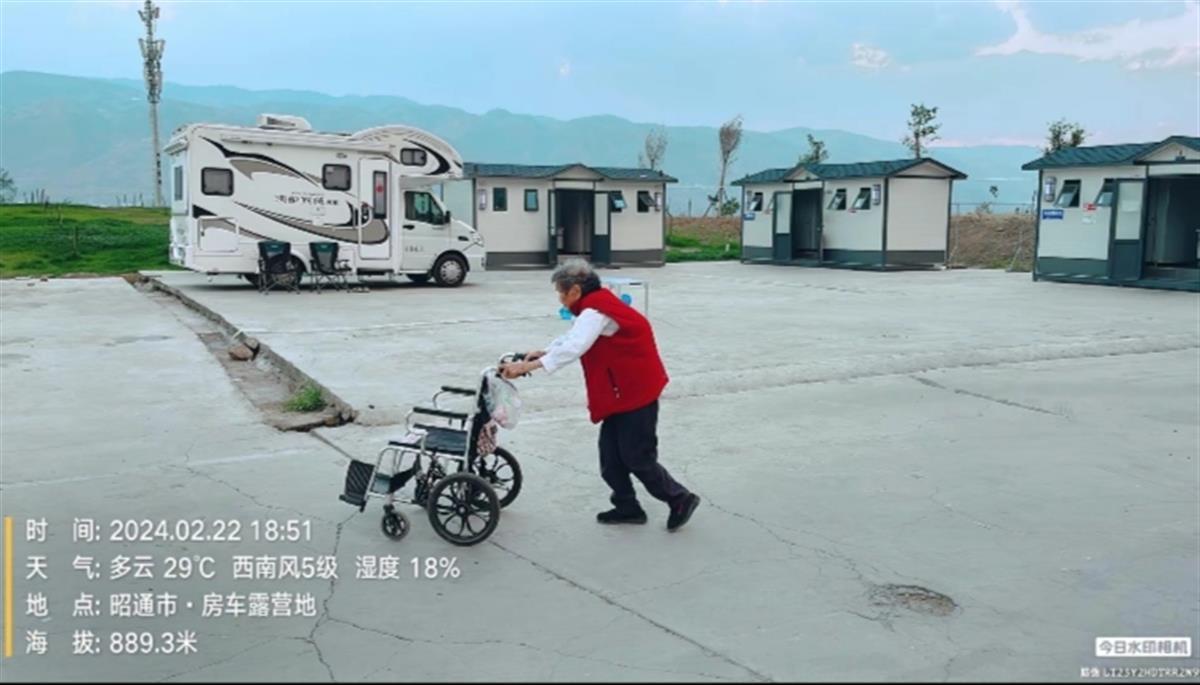 最近两天,王先生一家旅行到了巧家县的,因为是带着百岁老母亲旅行,他们一到房车营地就引来其他游客的关注。一位来自山西的房车旅行者还特意在短视频网站发文:“在巧家栗喉峰虎营地见到一个不可想象的旅行者,这个照片中的老人是我旅行旅居这么多年来见过的最年长的老人……步履蹒跚,靠轮椅扶行……如此的高龄腰已经直不起来了,但是她就出来过一下很多身体健康的人不敢做的事……”