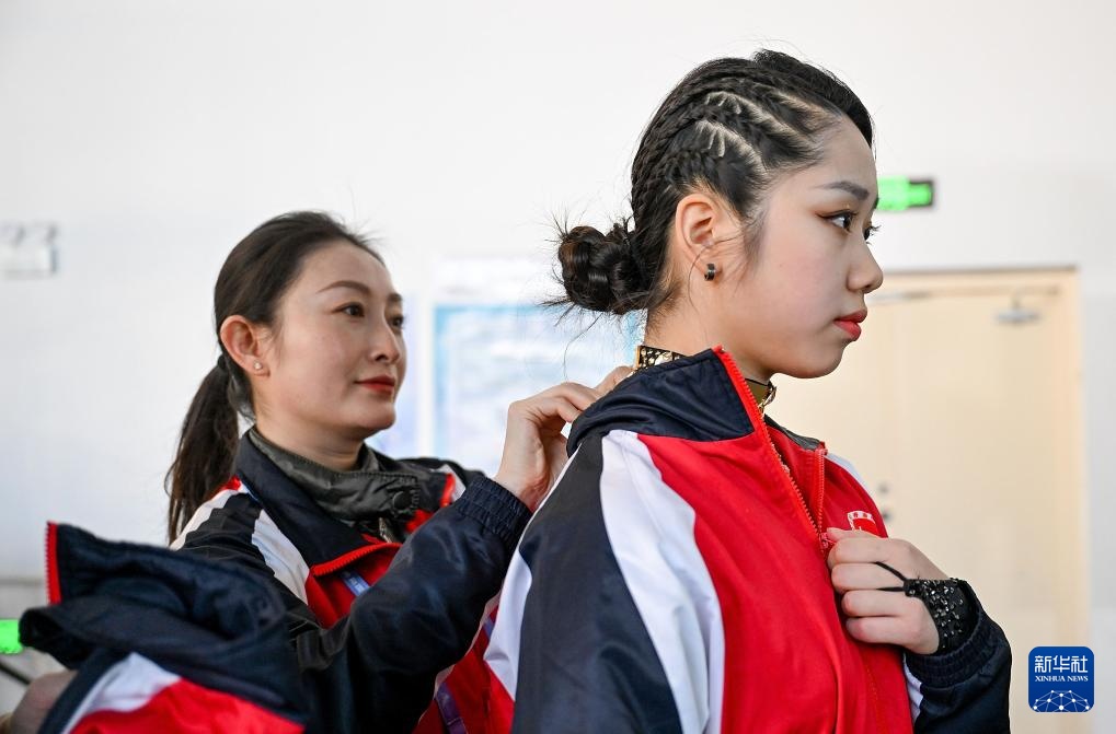 2月20日,香港花样滑冰队教练杨芳(左)为队员康然整理服装。