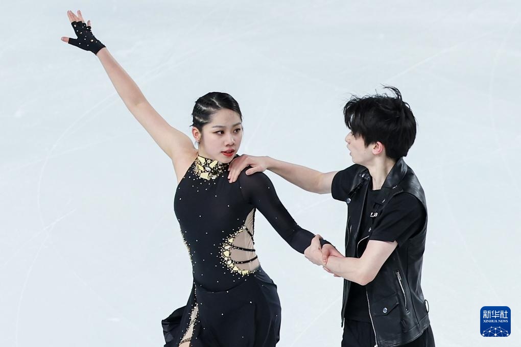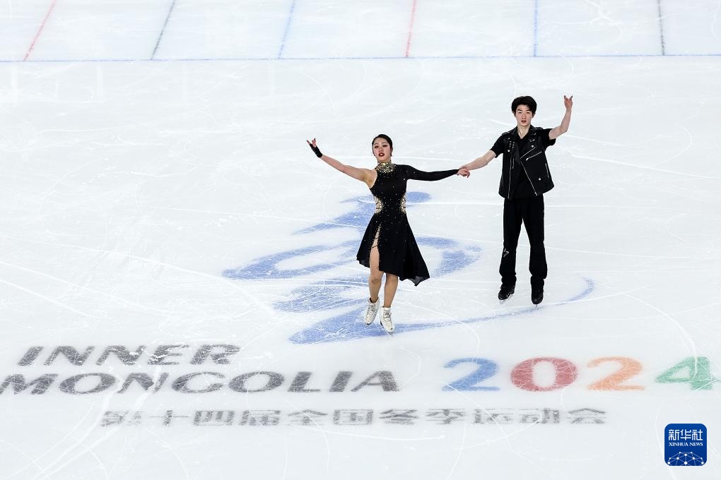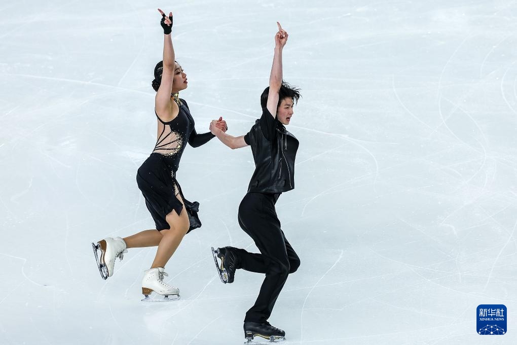 2月21日,香港队组合康然/邹函运(右)在第十四届全国冬季运动会花样滑冰公开组团体赛冰舞韵律舞比赛中。