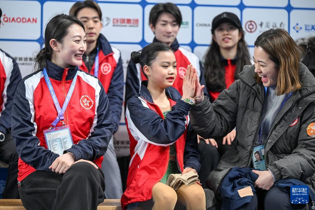 2月21日,在第十四届全国冬季运动会花样滑冰公开组团体赛女子单人滑短节目比赛中,香港队选手郭幸仪(前左二)在等分区与领队叶丹丹击掌庆祝。