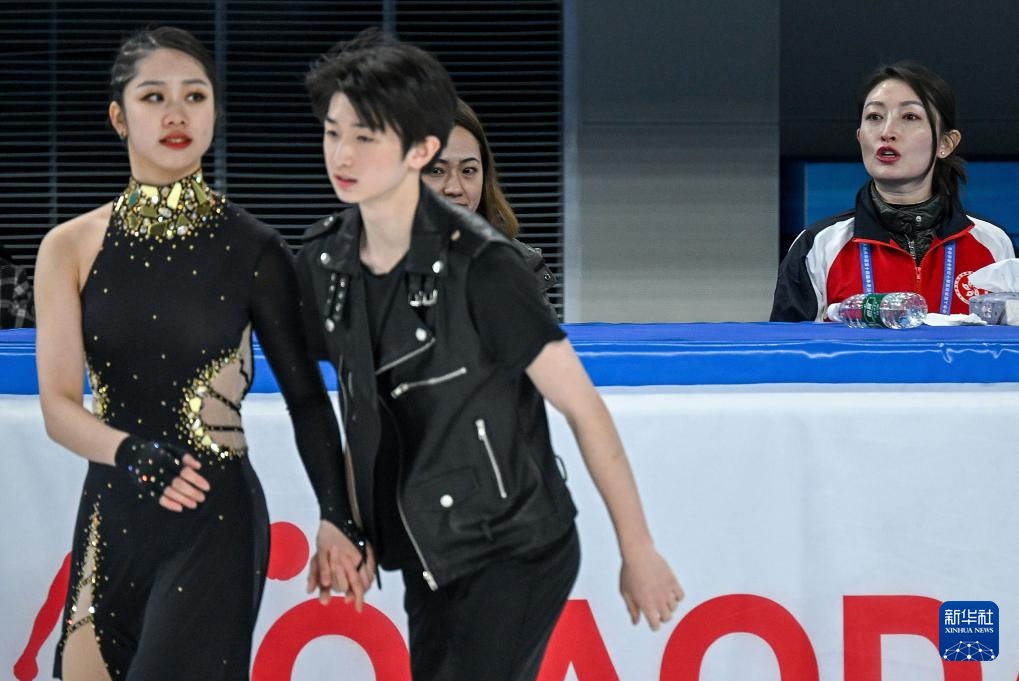 2月21日,在第十四届全国冬季运动会花样滑冰公开组团体赛冰舞韵律舞比赛中,香港队教练杨芳(右一)为队员康然(左一)、邹函运(左二)加油。
