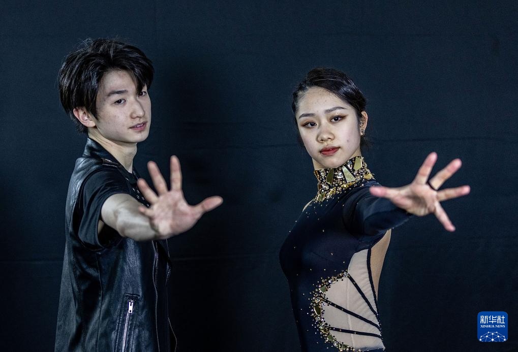 2月20日,香港花样滑冰队冰舞组合康然(右)/邹函运在录制“十四冬”赛前运动员介绍视频。