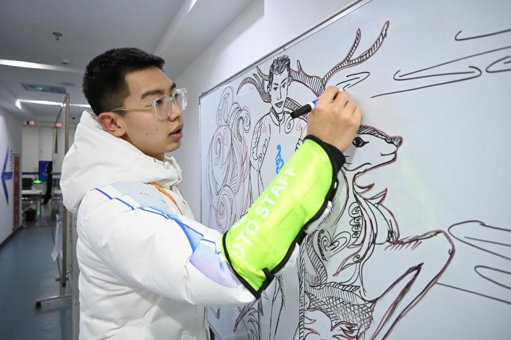 这些画作的作者杨雨霏是冰球冰壶馆的宣传工作部志愿者,呼伦贝尔学院美术专业大四年级的他,通过绘画和同学们一起体会了冰雪运动的魅力。“我想让枯燥的赛事信息变得有趣,于是把龙元素和冰壶、冰球项目融合,让场馆多点年味,也让大家伙快乐工作。”