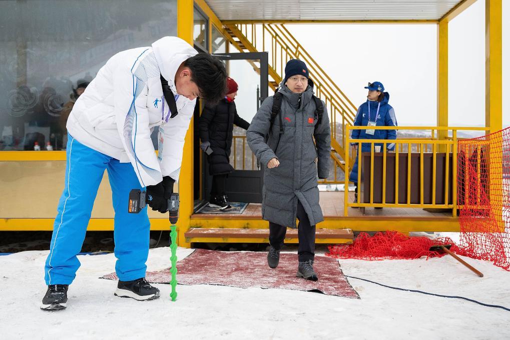 2月18日,在扎兰屯赛区,竞赛服务志愿者(左一)在裁判房前的雪地上钻孔防滑。新华社记者 谢剑飞 摄