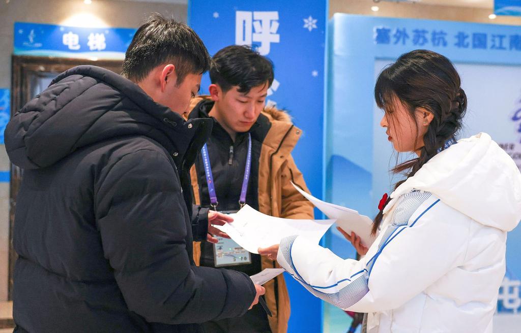 2024年2月18日,在扎兰屯赛区,志愿者(右)为媒体工作人员提供比赛信息。新华社记者 王楷焱 摄