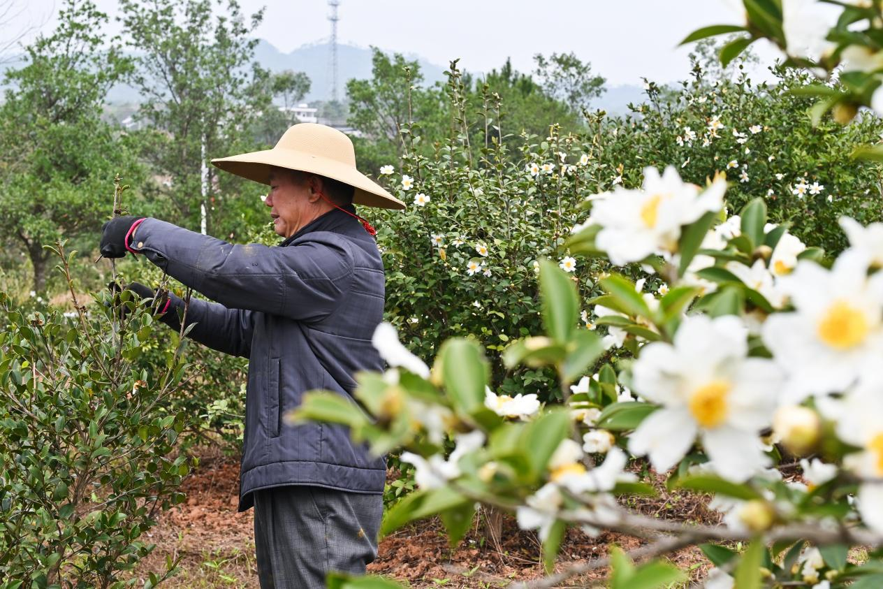 油茶成为粤东西北山区农民的重要林业经济作物,图为种植户在修剪油茶树(央广网记者 官文清 摄)