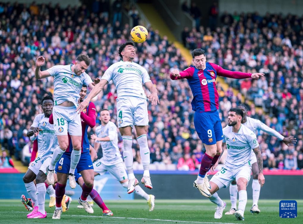 2月24日,巴塞罗那队球员莱万多夫斯基(上右)与赫塔菲队球员阿尔瓦雷斯(上中)争顶头球。