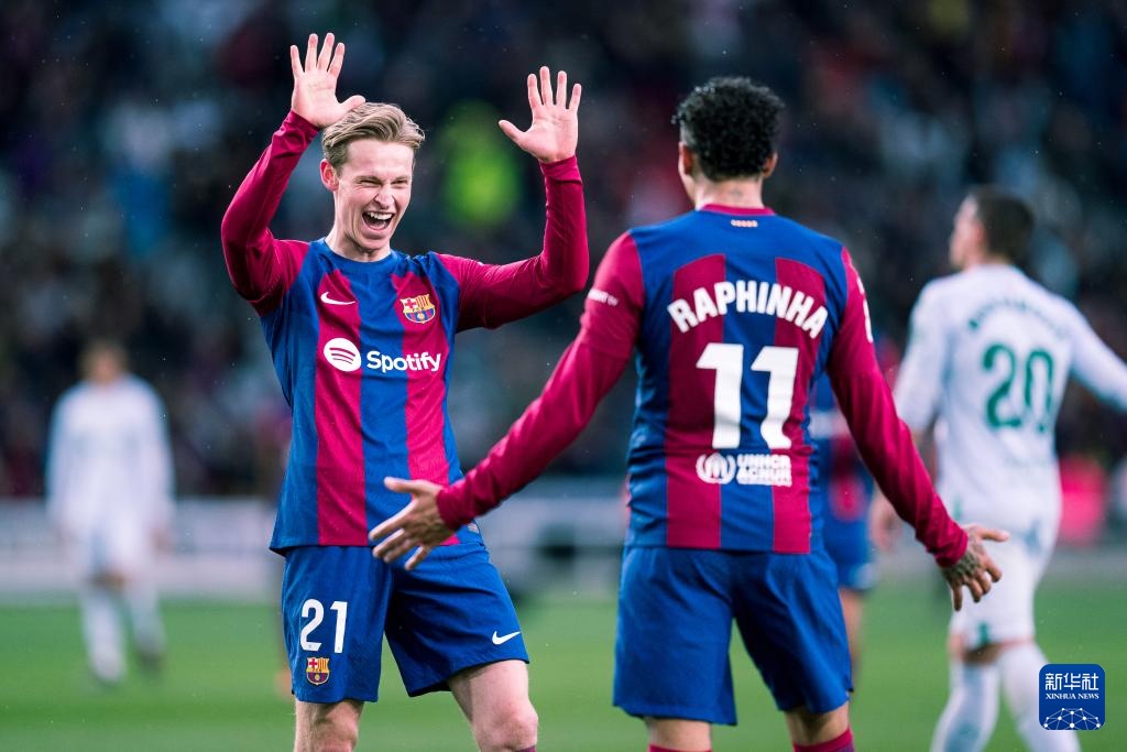 2月24日,巴塞罗那队球员德容(左)与队友拉菲尼亚庆祝进球。