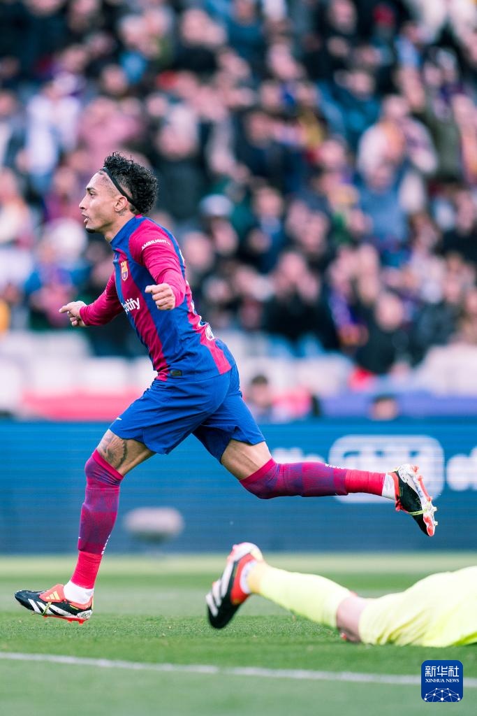 2月24日,巴塞罗那队球员拉菲尼亚庆祝进球。