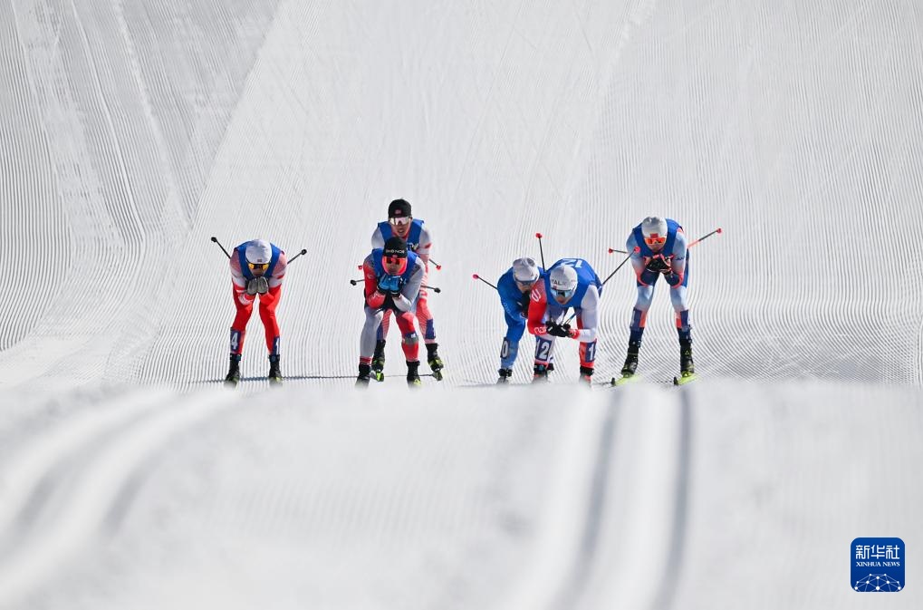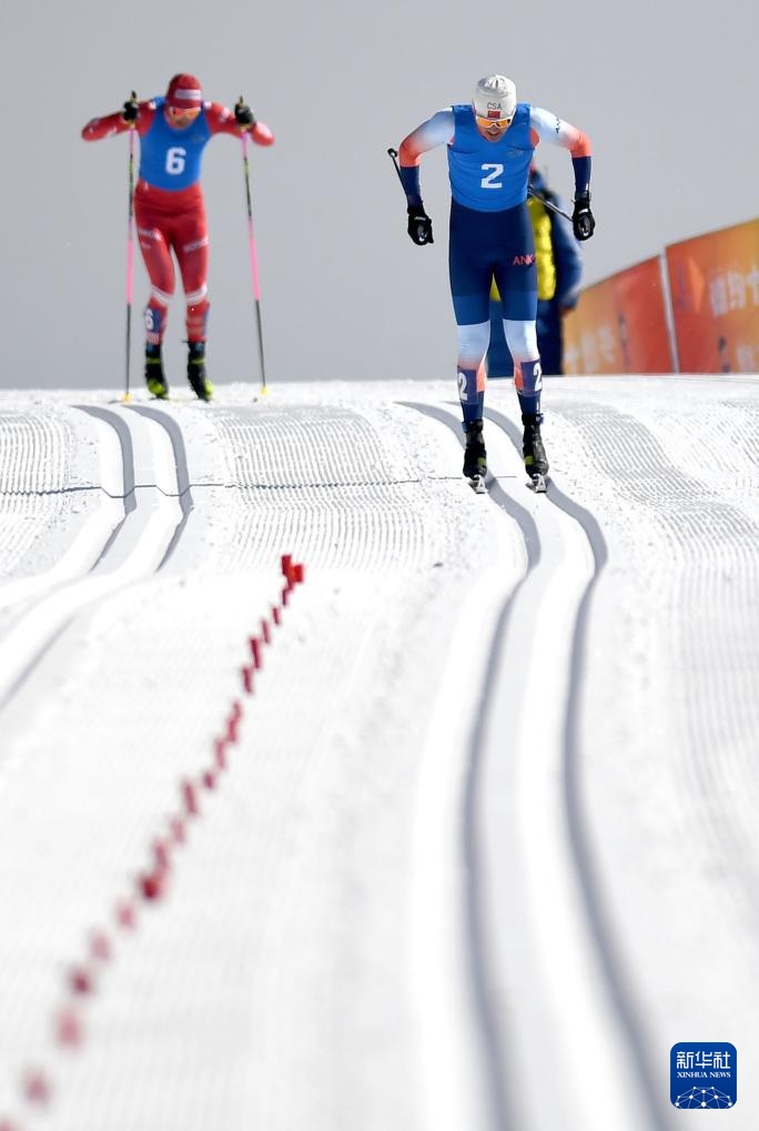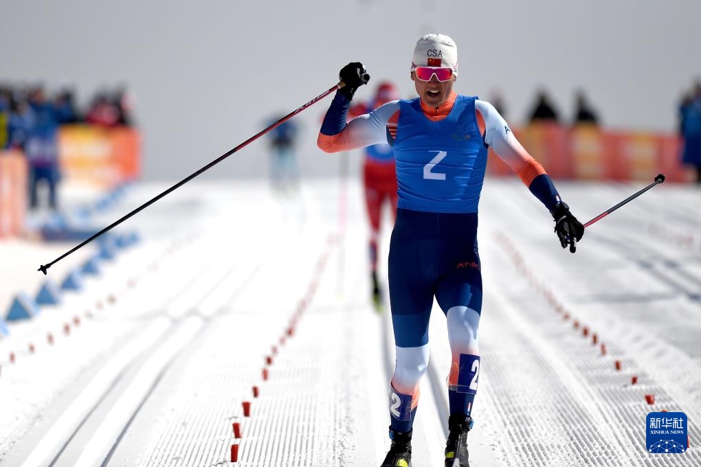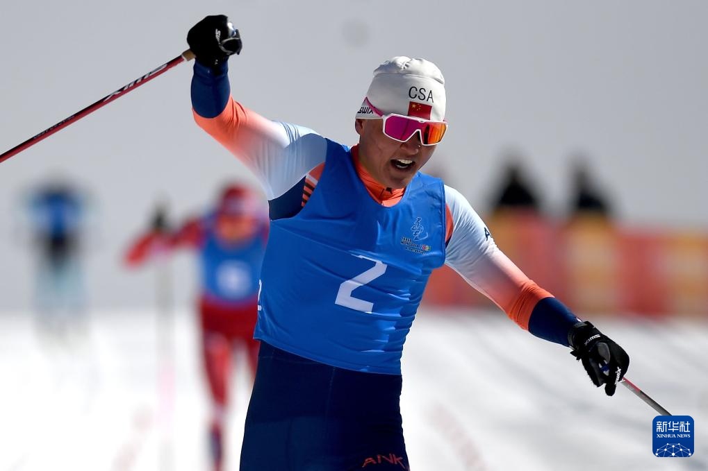 2月25日,新疆队选手赛木哈尔·赛力克(前)在冲刺时庆祝。