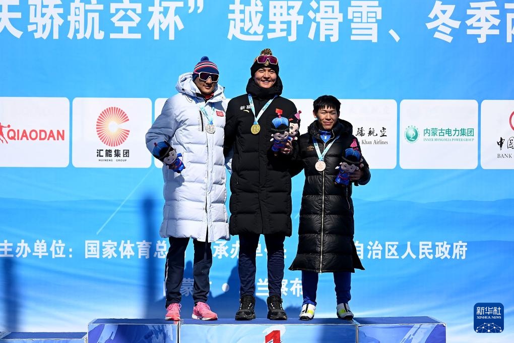 2月25日,冠军新疆队选手赛木哈尔·赛力克(中)、亚军吉林队选手古龙择仁(左)和季军河北队选手马德辉在颁奖仪式上合影。