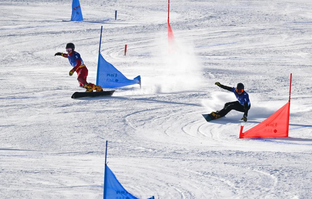 1月25日,内蒙古队选手班学福(右)与四川队选手秦梓涵在“十四冬”单板滑雪平行大回转比赛中。新华社记者 刘磊 摄