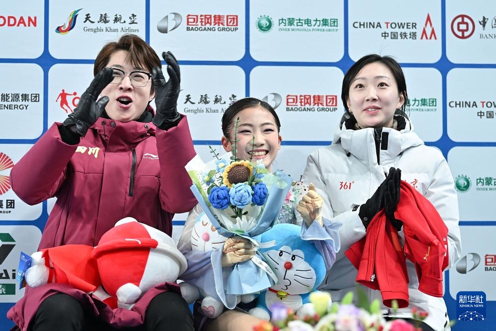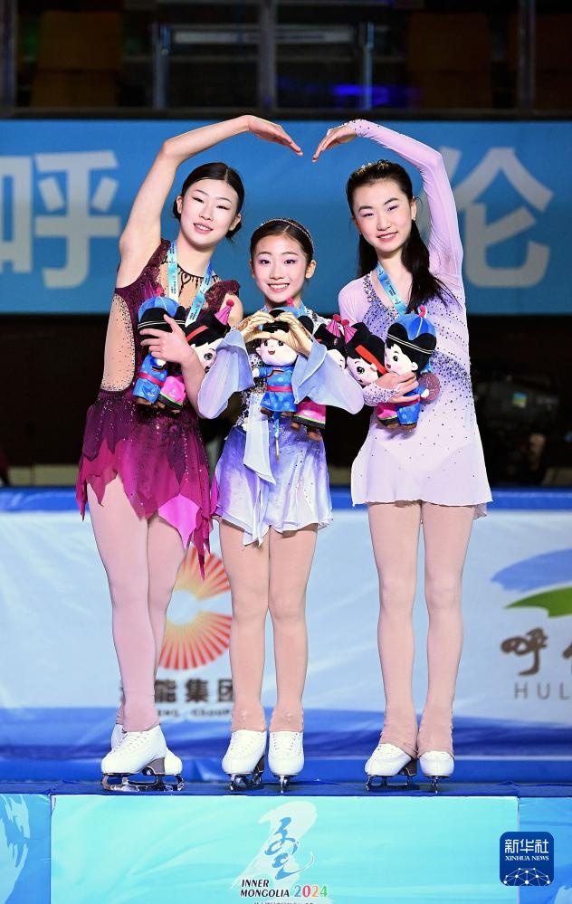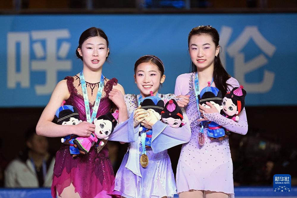 2月25日,四川队选手金书贤(中)、北京队选手安香怡(左)、吉林队选手张梦琪在颁奖仪式上合影。新华社记者 连振 摄
