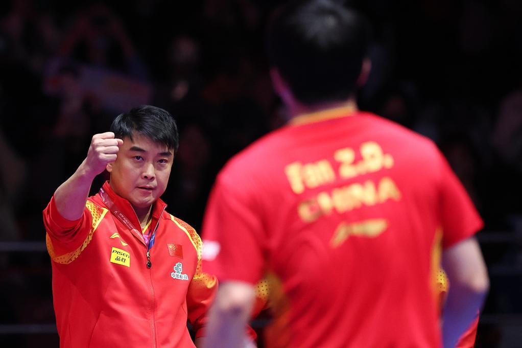 2月25日,中国队教练王皓(左)在场边为樊振东加油。新华社记者 杨世尧 摄