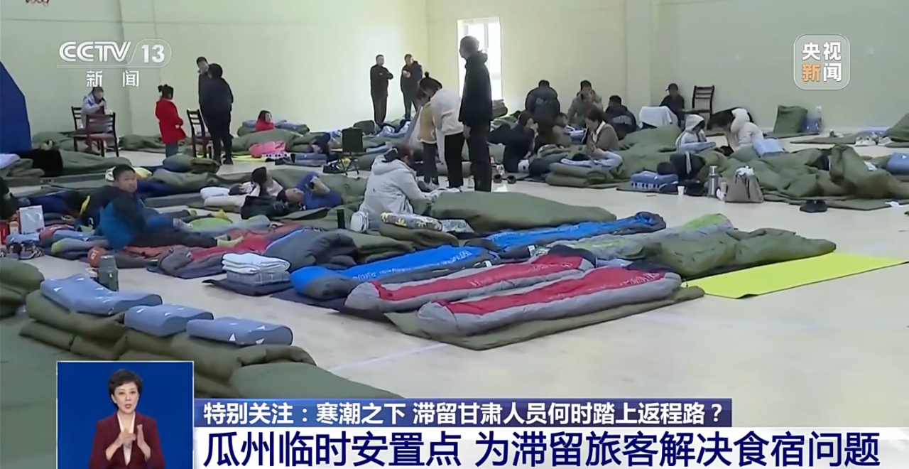 大量旅客滞留后,瓜州县应急管理局启动应急响应,将滞留旅客安置在酒店、学校、养老院等93个临时安置点和居民家中。同时,县政府还紧急调拨了折叠床、棉大衣等3000余件套,买来泡面、面包、牛奶等免费供滞留旅客食用。