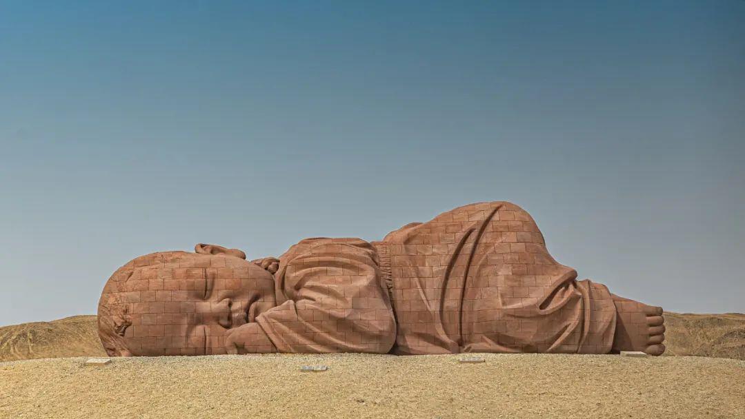 行走在戈壁滩,你会偶遇一个俯卧酣睡的“婴儿”。这是一座名为“大地之子”的雕塑,由清华大学美术学院雕塑系教授董书兵创作,以红砂岩为主要材质,利用三维扫描获取模型数据,再分块进行3D雕刻,最后逐块雕砌安装成型。