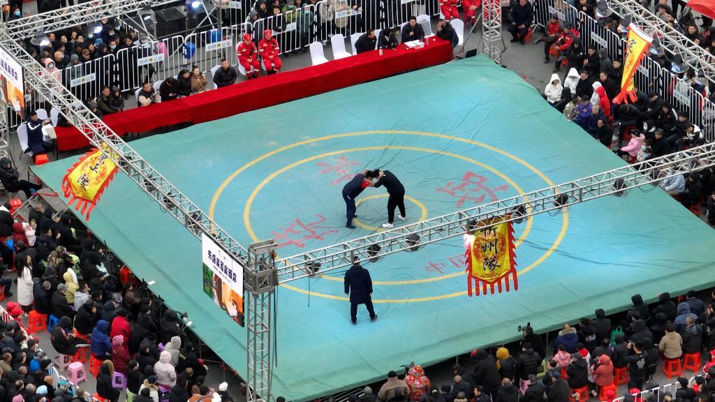 “抱腿!使劲儿!倒了倒了!”农历正月初十下午,山西省忻州市忻州古城广场上人山人海,一场激烈的挠羊赛正在上演。赛场上,两名选手斗技角力,争得面红耳赤。赛场下,观众扯着嗓子加油、叫好,喊得也是满脸通红。