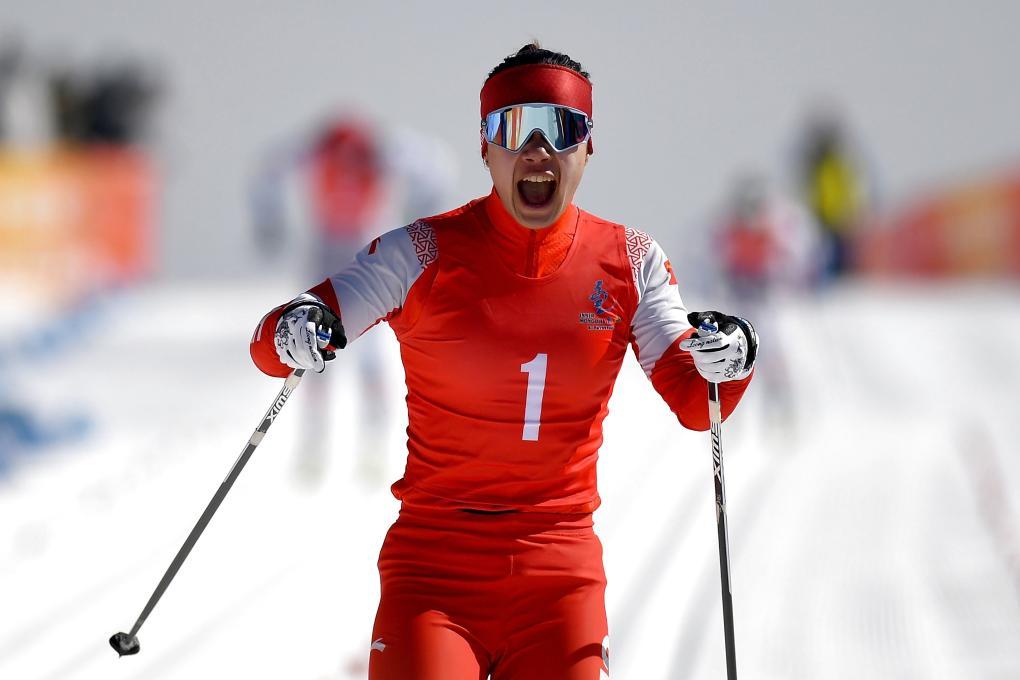 2月25日,黑龙江队选手靳然在冲刺时庆祝。新华社记者 黄博涵 摄