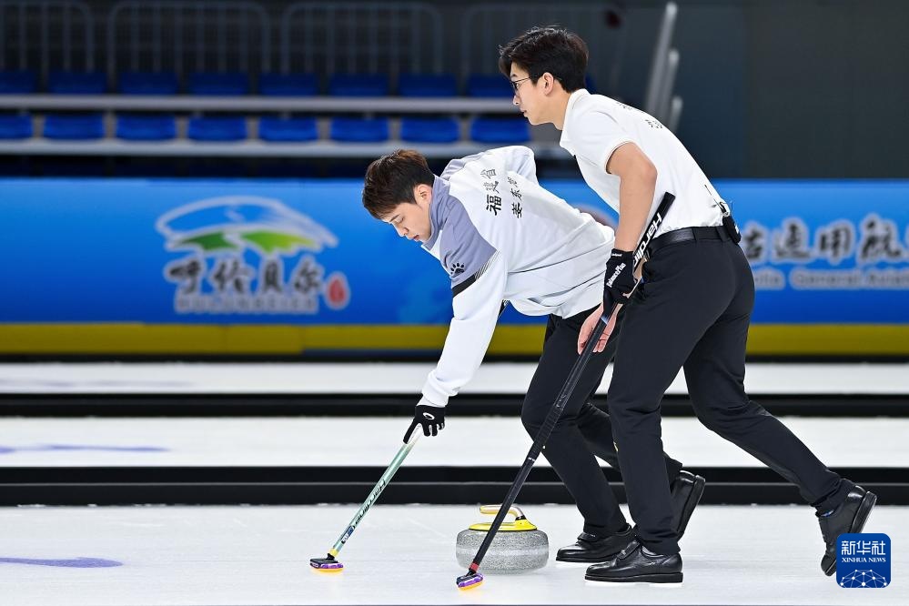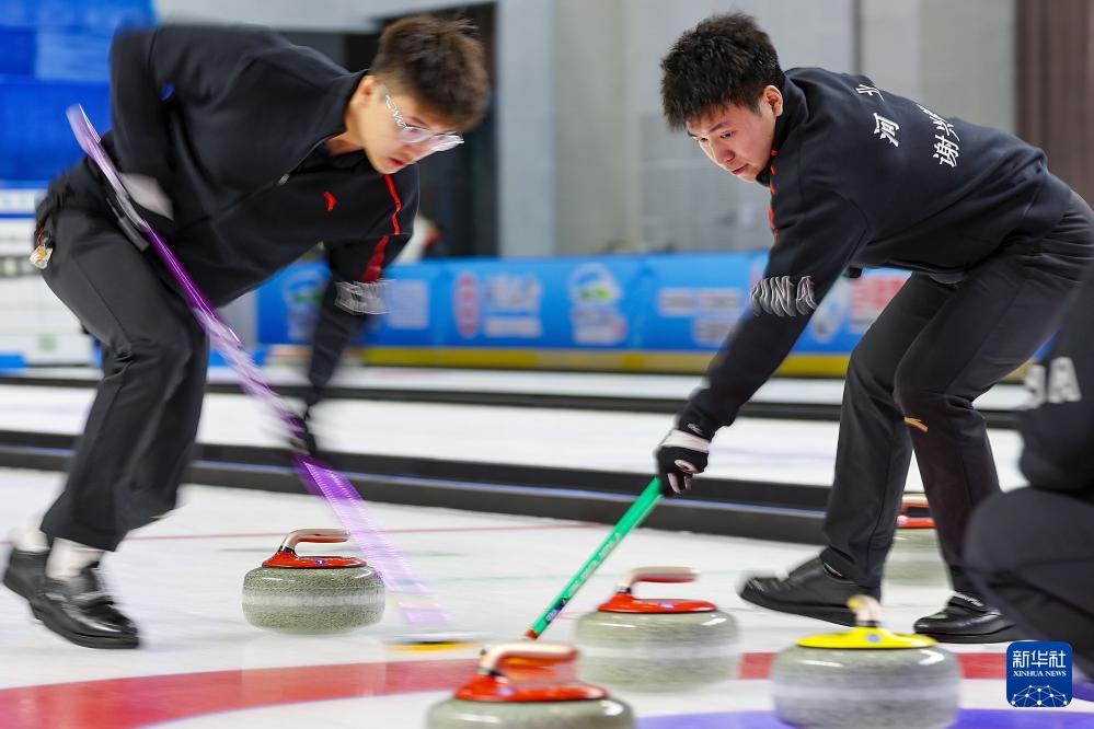 2月26日,河北队选手李智超(左)和谢兴银在比赛中擦冰。新华社记者 姜帆 摄