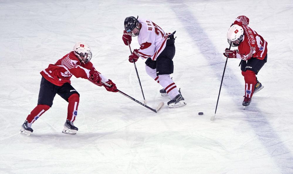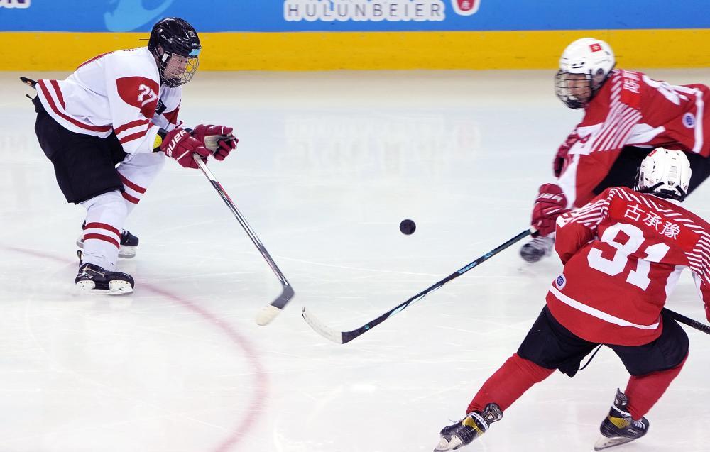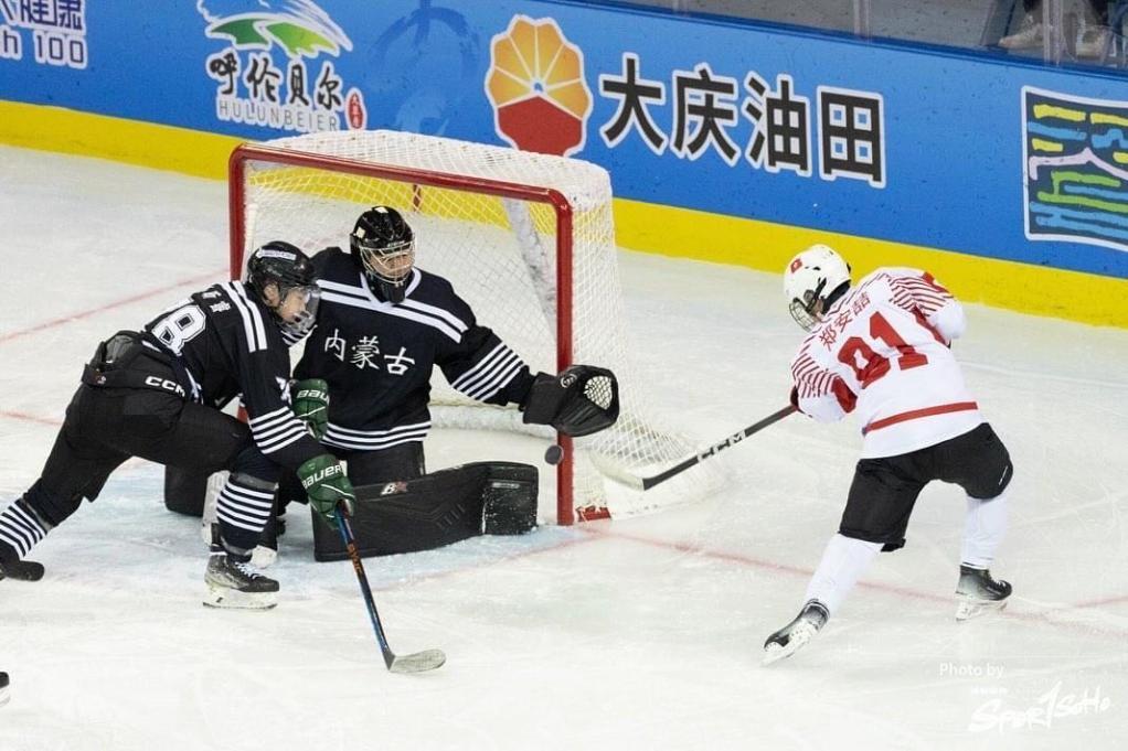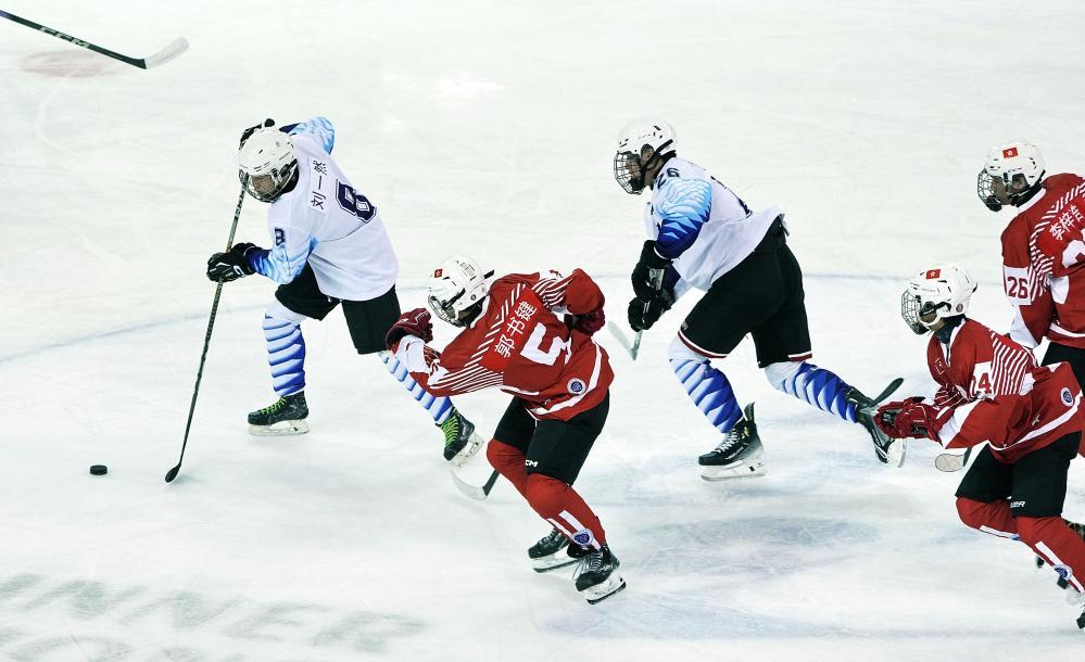 在“十四冬”冰球项目青年男子组比赛中