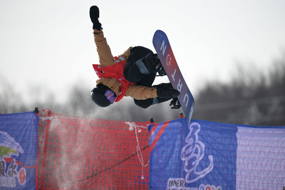 2月16日,12岁的山西队选手周苡竹在十四冬单板滑雪公开组女子U型场地技巧预赛中。