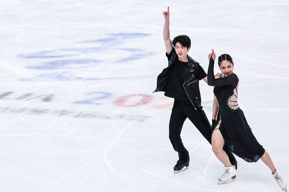 2月24日,香港队组合康然(右)/邹函运在十四冬花样滑冰(公开组)冰上舞蹈韵律舞比赛中。