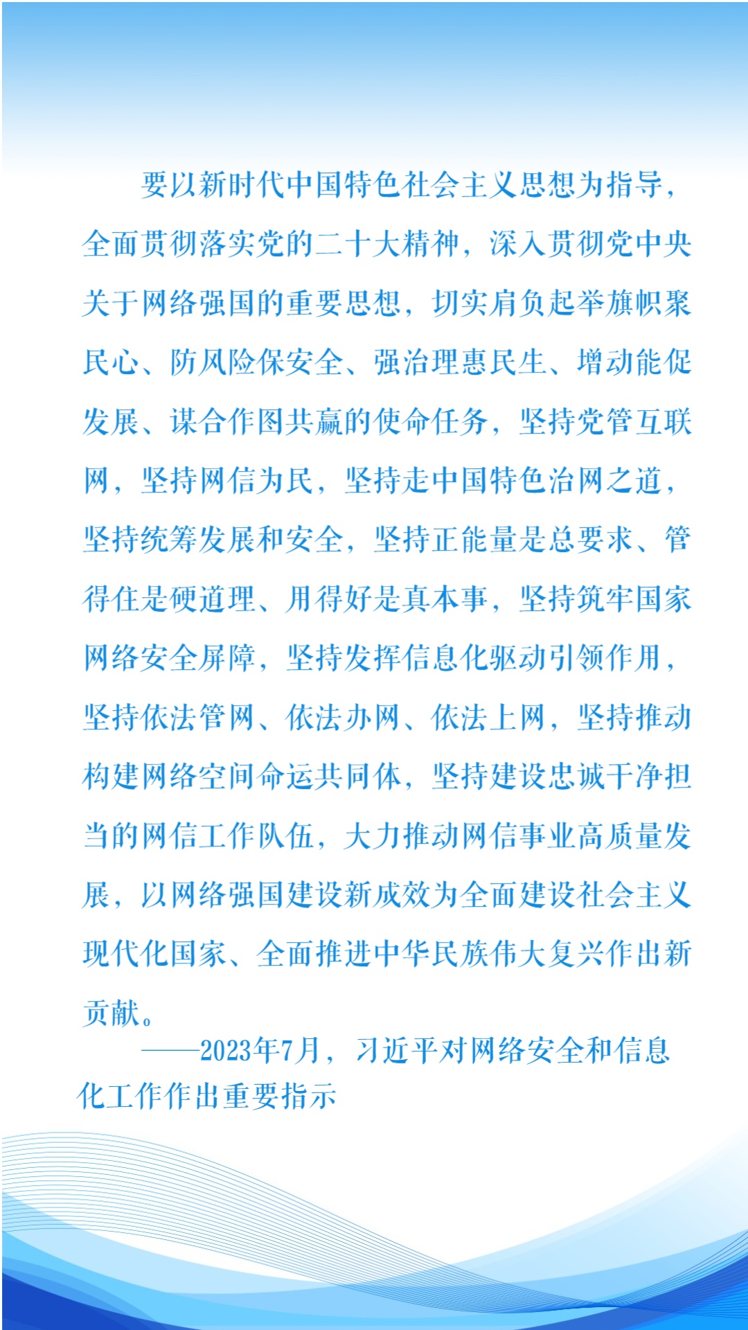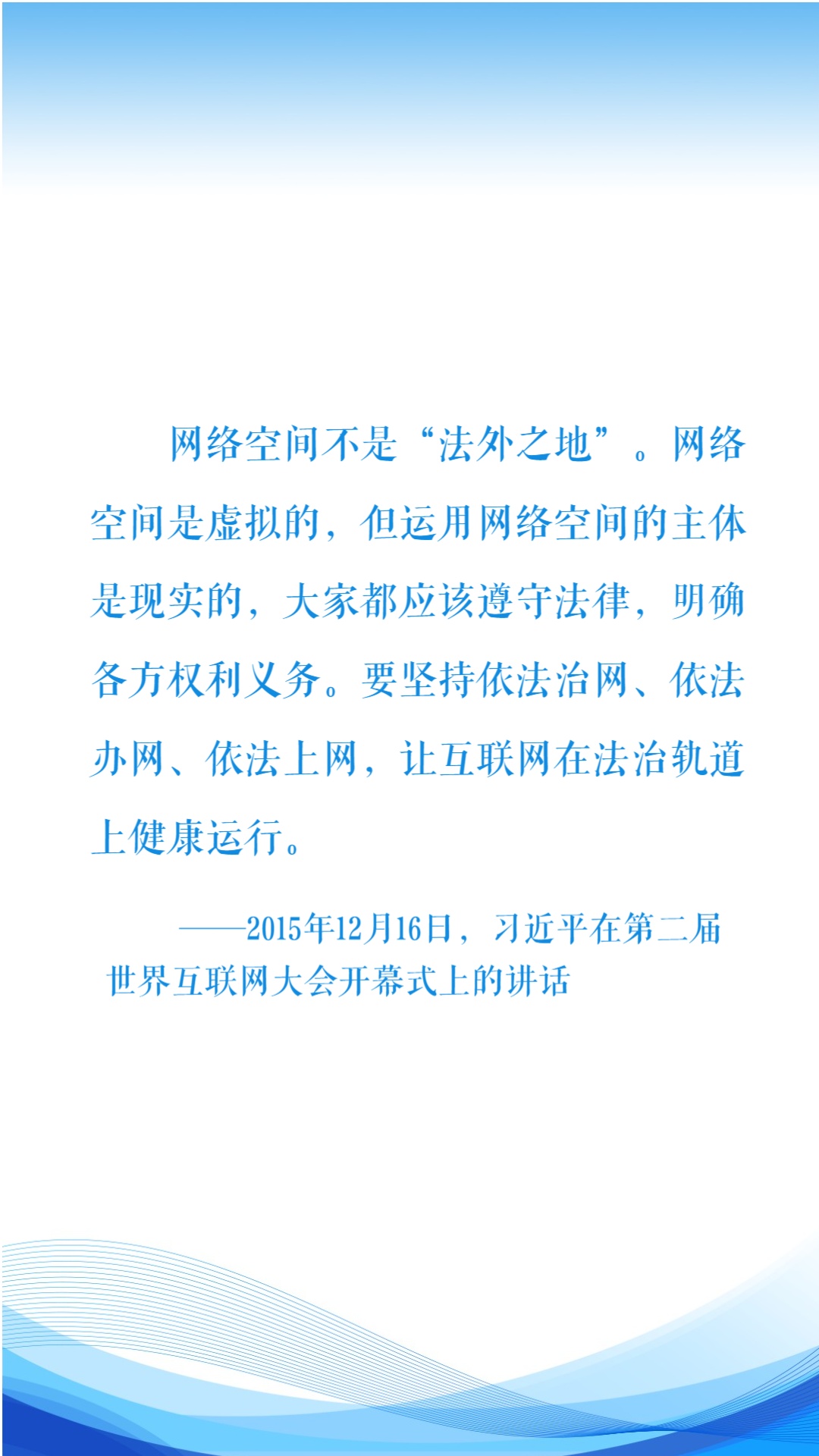 我们要始终坚持以人民为中心的发展思想,坚定不移地走依法治网之路,把体现人民利益、反映人民愿望、维护人民权益、增进人民福祉落实到全面依法治国各领域全过程,不断推动网络空间运转的规则化、治理的法治化,以更加健全的法治体系,为网络强国建设保驾护航。(肖聪聪)