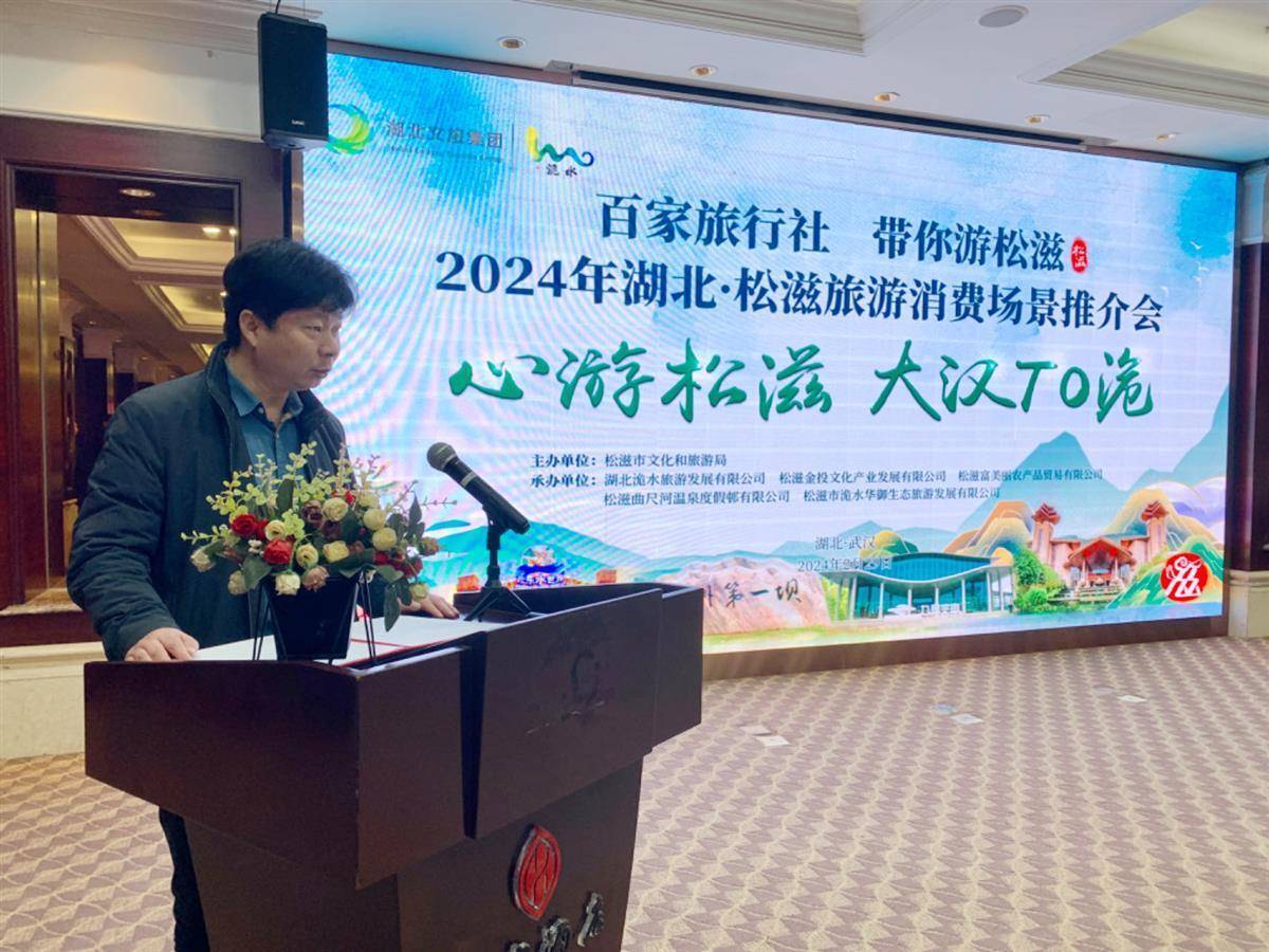 湖北日报讯 (记者王晶、通讯员聂赵阳)为充分整合松滋全域旅游资源,持续提升松滋旅游品牌影响力,2月29日, 2024年“百家旅行社 带你游松滋”湖北·松滋旅游消费场景推介会武汉专场在湖北文旅洪宾红莲湖酒店隆重举行。本次活动由松滋市文化和旅游局主办,湖北洈水旅游发展有限公司、松滋金投文化产业发展有限公司、松滋富美丽农产品贸易有限公司、松滋曲尺河温泉度假邨有限公司、松滋市洈水华御生态旅游发展有限公司共同承办。武汉各区渠道商代表及媒体、网络达人代表参加。