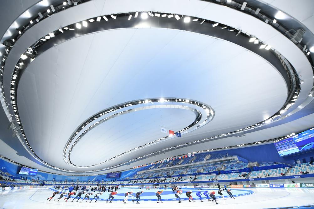 2023年11月19日,参赛选手在2023-2024赛季国际滑联速度滑冰世界杯(北京站)男子集体出发A组比赛中。新华社记者 鞠焕宗 摄