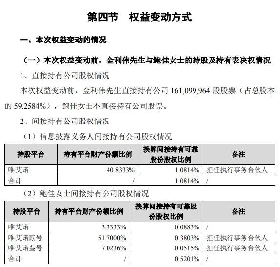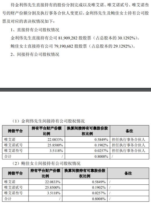 公告显示,金利伟和鲍佳持有的唯艾诺、唯艾诺贰号、唯艾诺叁号三家合伙企业的财产份额由双方均等分割,各占一半。唯艾诺贰号、唯艾诺叁号的执行事务合伙人将变更为金利伟。变更后,三家合伙企业的执行事务合伙人均为金利伟。