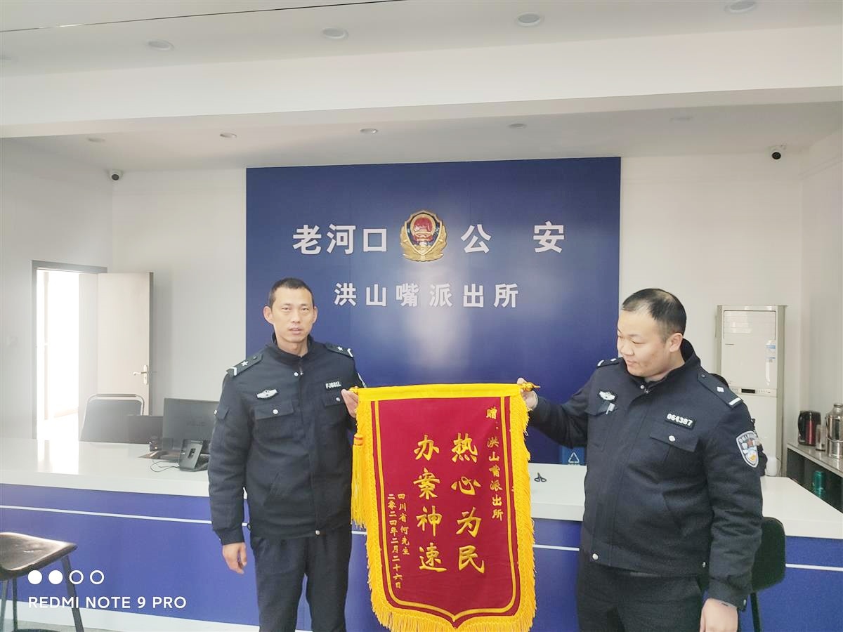 原来,近日洪山嘴派出所快速处置了一起车辆受损警情,帮助车主何先生挽回经济损失。何先生回到四川老家后,一直想要感谢派出所民警的帮助,又不知道民警姓名,便将当天出警的警车车牌号写在收件人一栏,特意寄来一面锦旗表示谢意。