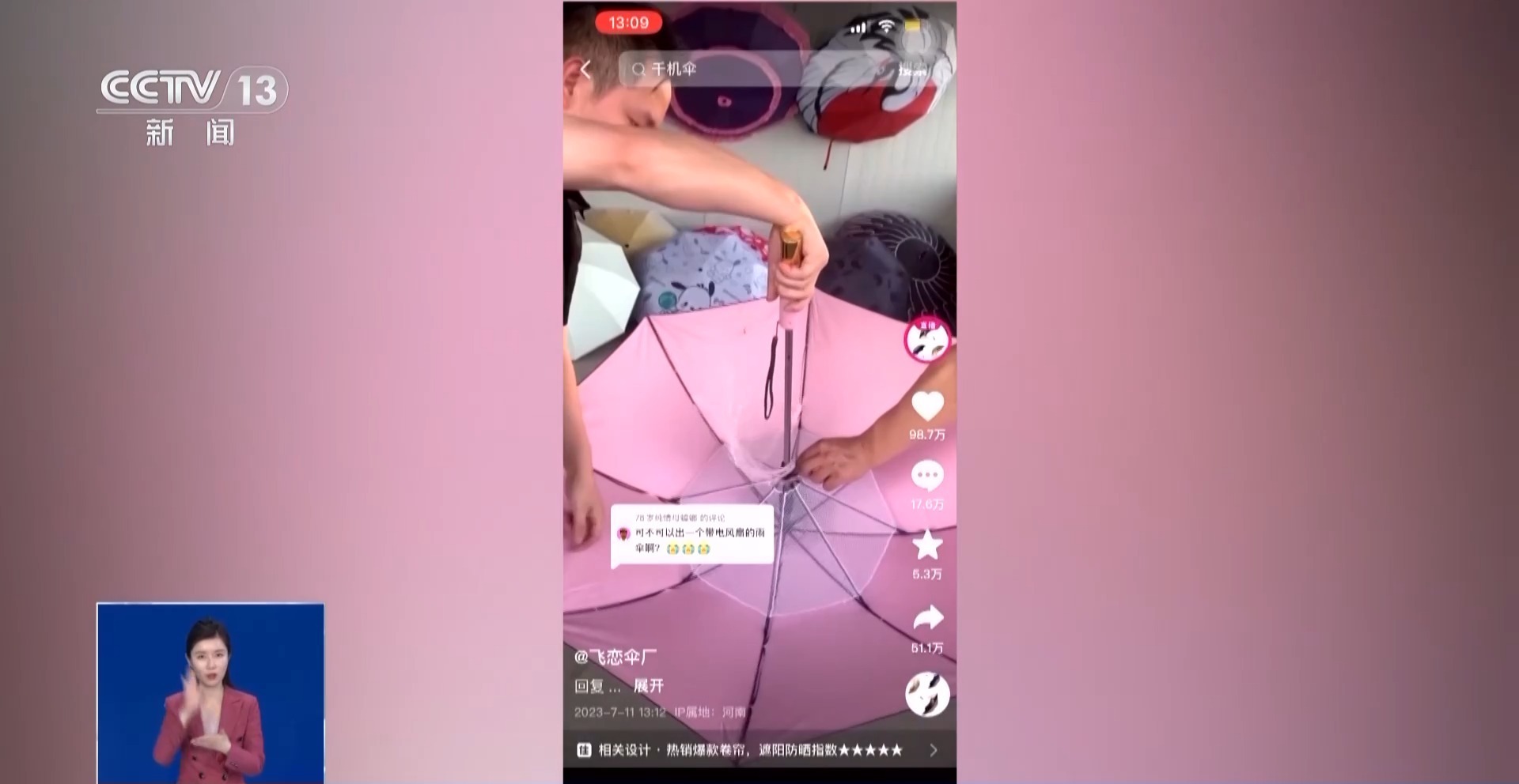 雷鹏琳:看了一条评论,他说,叔,我走夜路怕黑,怕被车撞,能不能做一把镭射反光伞,我就尝试着做了一把镭射反光伞。我们的设计师,我们的团队,他们内心很忐忑,我说咱们尝试一下,成本对咱们来说还能承受得起,我们就尝试做了一个预售链接,一个视频卖了7万多单,这个视频让我涨了差不多10万粉丝。