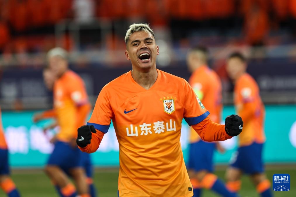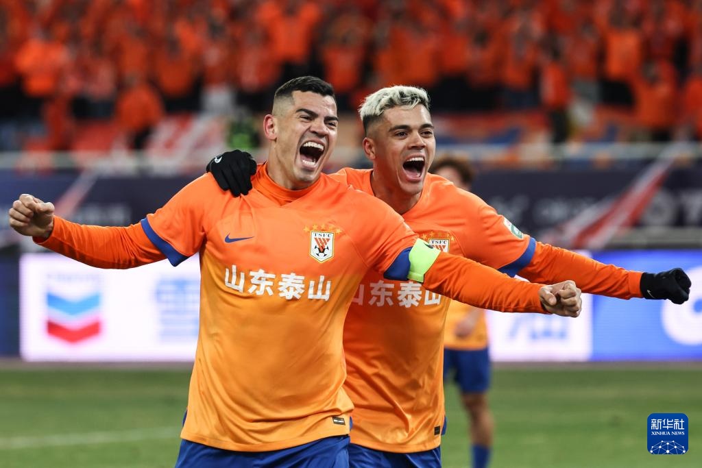 3月1日,山东泰山队球员贾德松(左)和队友帕托庆祝进球。