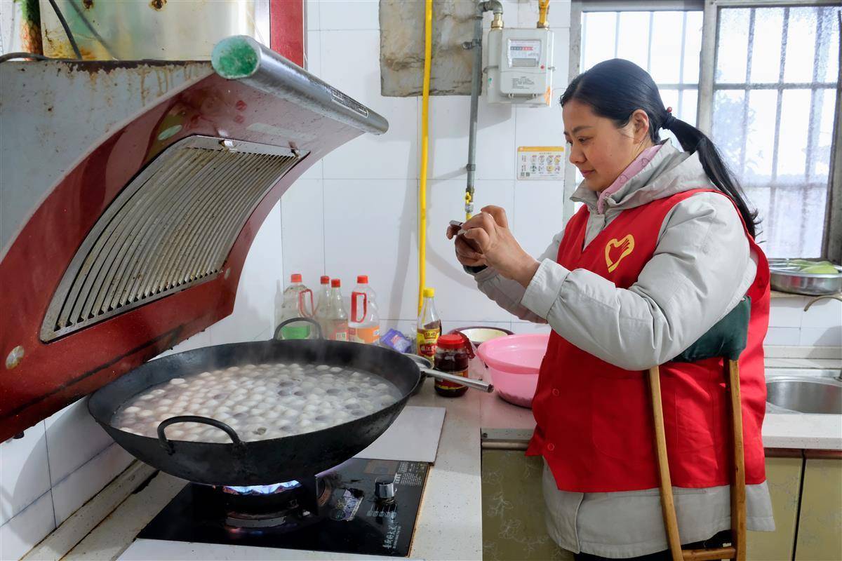 早餐和往常一样,是一碗热粥、两个馒头、两样小菜。当天是元宵节,赶来帮忙的10多名志愿者,特地煮了饺子和汤圆。