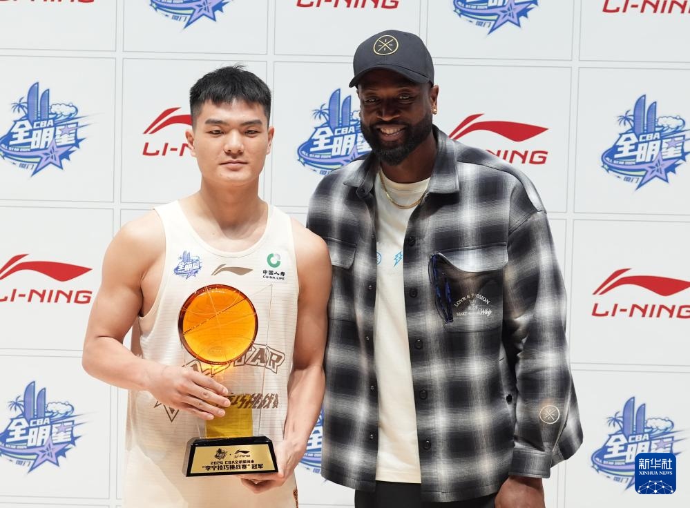 3月3日,前NBA球员韦德(右)为获得技巧赛冠军的黎伊扬颁发奖杯。新华社记者 孟永民 摄