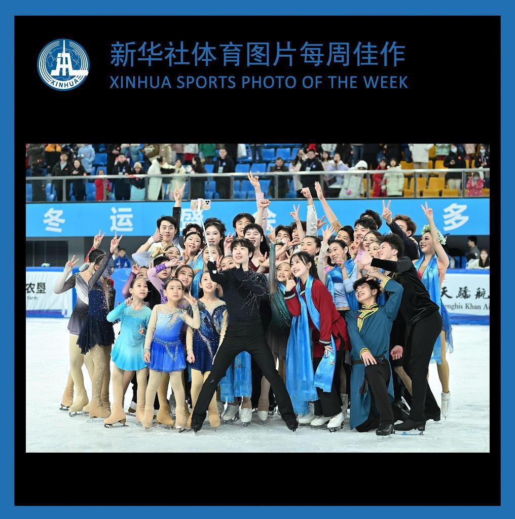 2月27日,表演滑结束后,花滑运动员们在赛场合影。