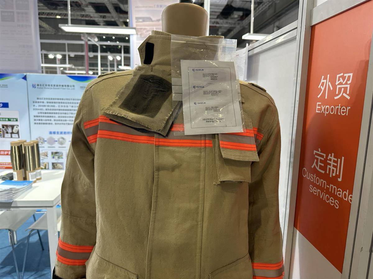 在湖北面料馆,襄阳企业汇尔杰新材料科技股份有限公司的展牌上,详细展示着它们的拳头产品——玄武岩纤维,一种能制成耐热1000摄氏度高温的纺织面料,主要应用在消防服、航空服等领域。