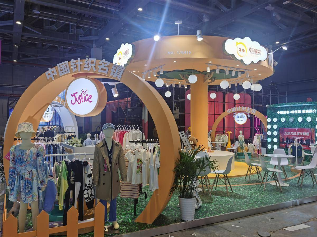 展馆中央,则是岑河童装展区,设计充满童趣。荆州沙市岑河镇是全国五大童装生产基地之一,婴童装年产量占全国1/8。
