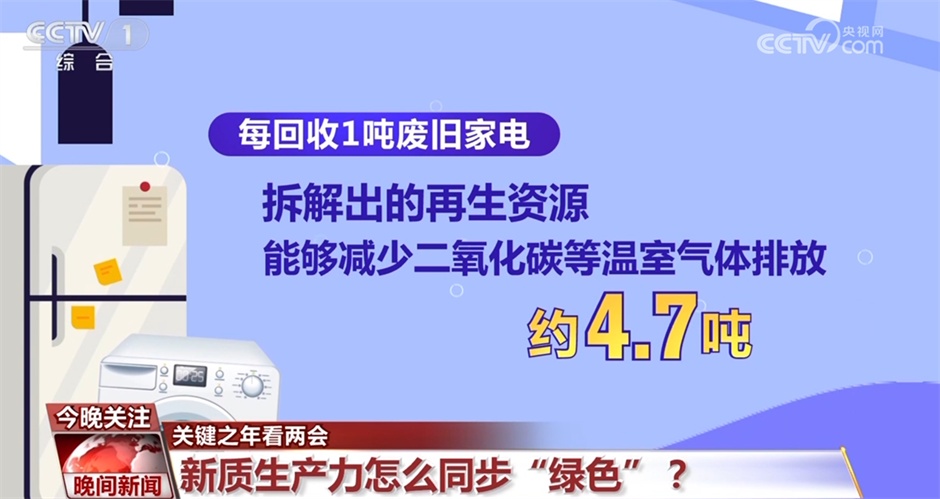 数据显示,2023年,冰箱、洗衣机、空调等主要品类家电保有量超过30亿台,一些家电使用了十多年、二十年,更新换代的需求和潜力很大。据统计,2023年,我国废旧家电回收总量达450万吨,而每回收1吨废旧家电,拆解出的再生资源能够减少二氧化碳等温室气体排放约4.7吨。