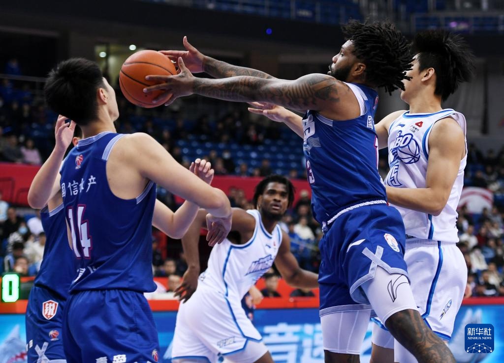 3月7日,青岛国信水产队球员鲍威尔(右二)在比赛中拼抢。新华社记者 李紫恒 摄