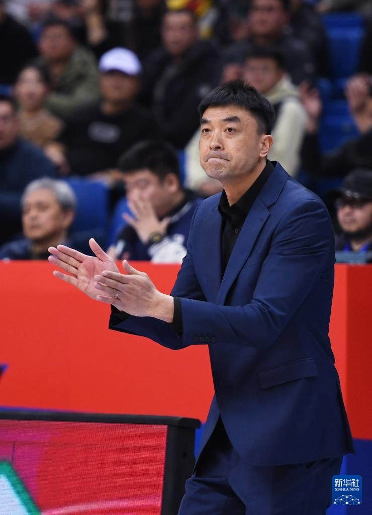 3月7日,青岛国信水产队教练刘明涛在比赛中鼓励球员。新华社记者 李紫恒 摄