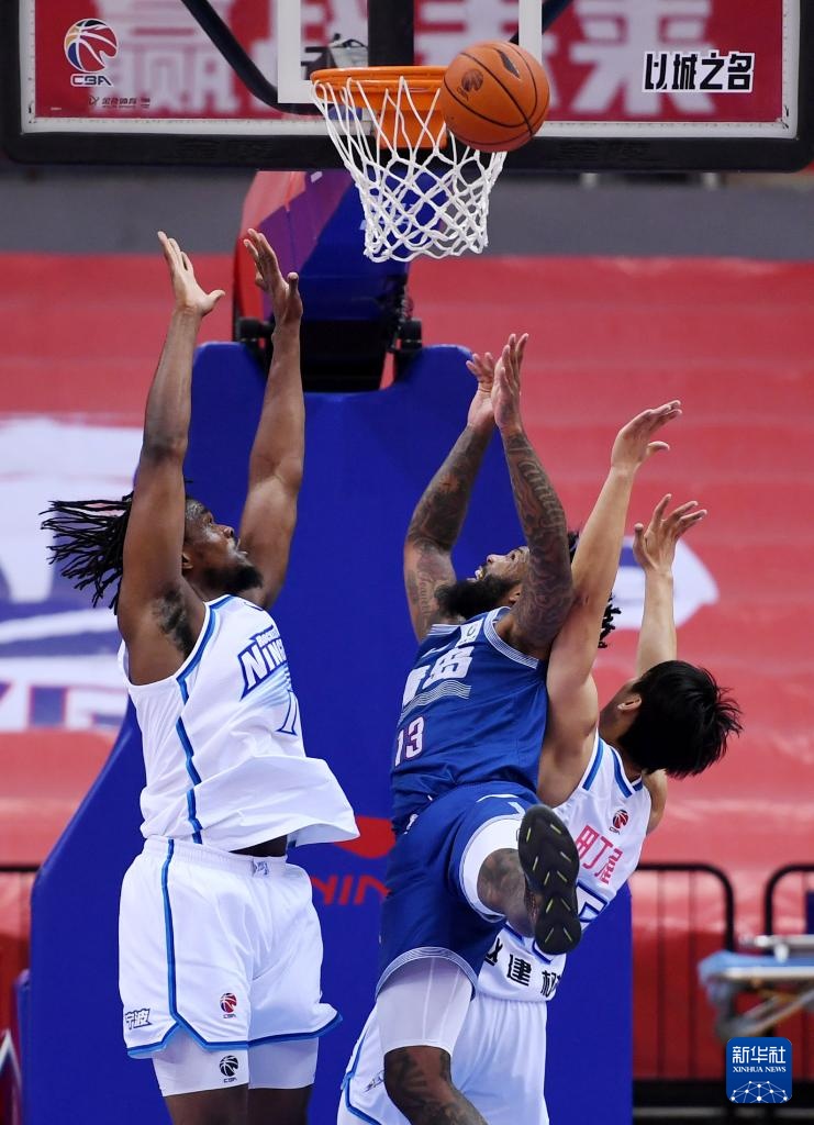 3月7日,青岛国信水产队球员鲍威尔(中)和宁波町渥队球员埃格伯努(左)在比赛中拼抢。新华社记者 李紫恒 摄