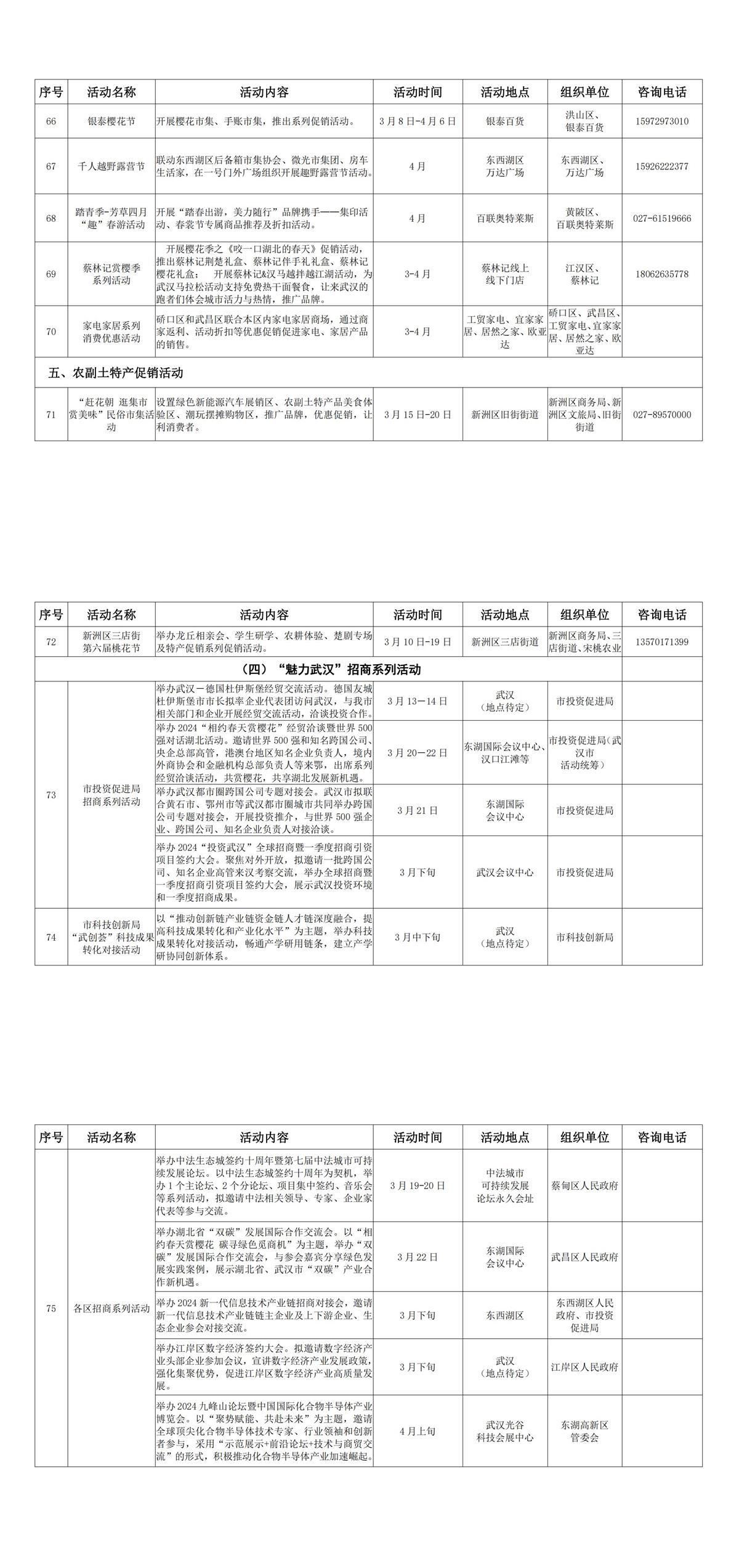 一是“浪漫武汉”文旅系列活动。串联全市赏花点、红色景点、绿色景区、特色街区、宗教人文景点和美食区域,推出“春游武汉十大推荐线路”,举办四大文旅系列活动。赏花系列活动,推出武汉十大赏樱点,重点打造“东湖樱舞”“珞樱缤纷”“晴川吹雪”三大赏樱品牌,同时推出油菜花、郁金香、杜鹃花等特色赏花游活动。主要包括“东湖樱花节”“武汉大学赏樱季”“晴川樱花节”“清凉寨中华樱花节”“云雾山杜鹃花节”“五里界油菜花节”“郁金香公园花展”,以及“长江灯光秀”樱花特辑等。国风系列活动,主要包括“园博园花朝嘉年华”“国风汉服城市巡游”“木兰不夜城花服节”等。艺文系列活动,主要包括“武汉大学生音乐节”“巫启贤、凤凰传奇等明星演唱会”“第十二届武汉戏码头中华戏曲艺术节”等各类演出活动,以及全市各大文博场馆举办的主题展。郊游系列活动,主要包括“木兰水镇春季游园会”“花博汇知音花月夜”“木兰花海春游记”等。
