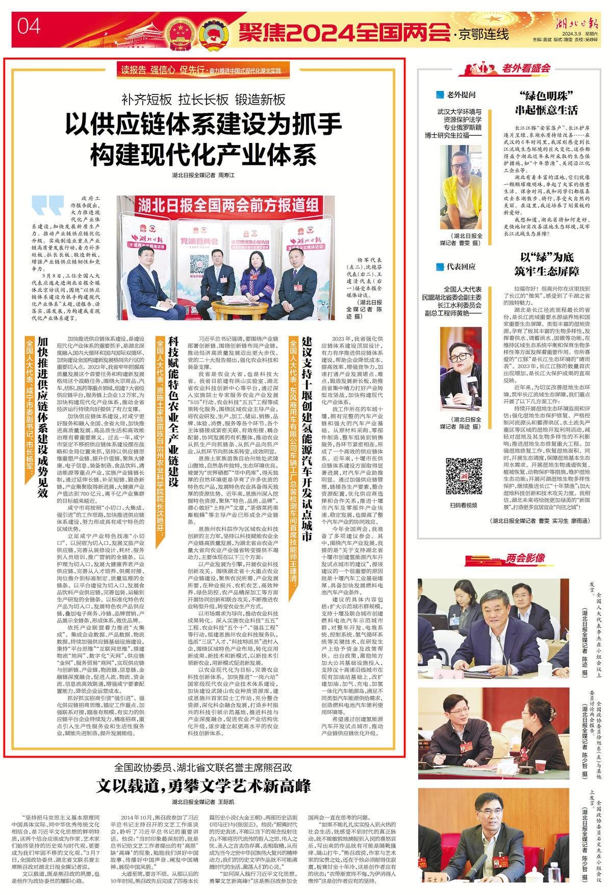 3月8日,三位全国人大代表应邀走进湖北日报全媒体北京访谈间,围绕“以供应链体系建设为抓手构建现代化产业体系”主题,读报告、话落实、谋发展,为构建我省现代化产业体系建言。